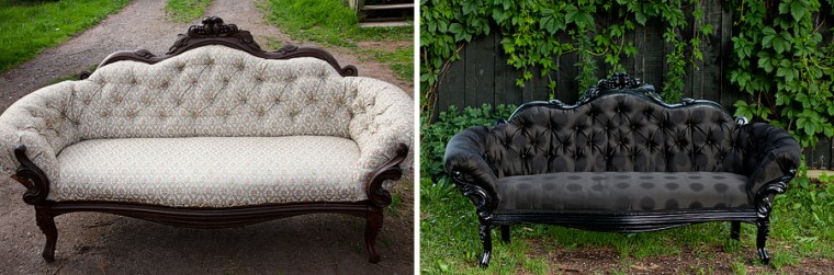 I have three Victorian sofas. One is the fabulous purple one that has become the unofficial hallmark of Borrowed. I have another smaller gold grapeback which is waiting to be upholstered; and I have this one. I had a heck of a time choosing fabric, wanting something unexpected. I finally settled on this black on black and decided I may as well go black all the way, painting the wood in a glossy finish. This wasn’t easy for me to do because at heart I love to preserve historical elements.